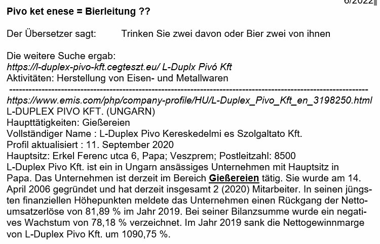 L-Duplex Pivo Kft. Kleinschacht hat nichts mit Bier (Pivo) zu tun